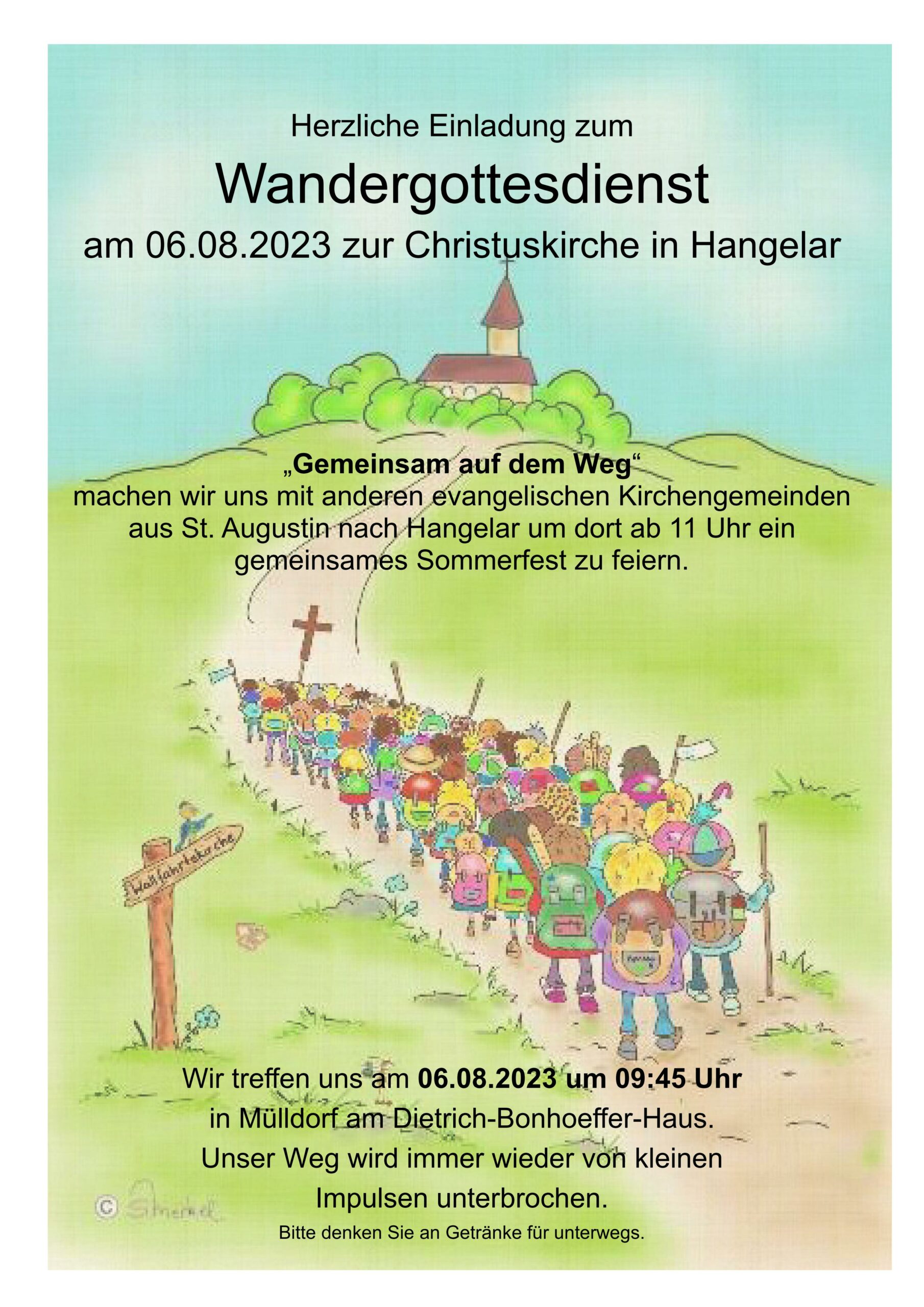Am Sonntag, dem 6. August pilgern wir von unserem Dietrich-Bonhoeffer Haus – Start 9:45 Uhr – in die Christuskirche in Hangelar, um dort gemeinsam mit allen evangelischen Gemeinden einen gemeinsamen Gottesdienst zu feiern. Musikalisch begleitet wird der Gottesdienst von der Gläsner-Band. Auf dem Weg dorthin wird es ein paar Stationen geben, an denen wir innehalten. Nach dem Gottesdienst in Hangelar um 11 Uhr wird es ein großes gemeinsames Grillfest geben.