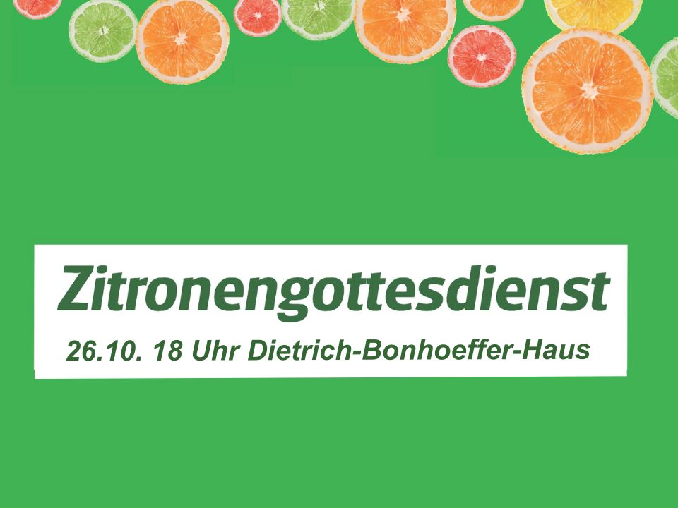 Zitronengottesdienst am 26. Oktober Herzliche Einladung zum Zitronengottesdienst am 26. Oktober um 18 Uhr im Dietrich-Bonhoeffer-Haus. Wie immer erfrischend und bunt, mit Live-Musik und „Bread, Cheese and Wine” (oder auch Saft, Sprudel und … ). Zitronengottesdienst – die andere Art, das Wochenende ausklingen zu lassen. Allgemein