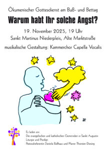 Es ist eine liebgewordene Tradition in Sankt Augustin, den Buß- und Bettag ökumenisch zu feiern. In diesem Jahr lädt die katholische Gemeinde nach Sankt Martinus Niederpleis ein, gestaltet wird der Gottesdienst von Daniela Ballhaus und Thorsten Diesing. Die Capella Vocalis gestaltet den musikalischen Rahmen.