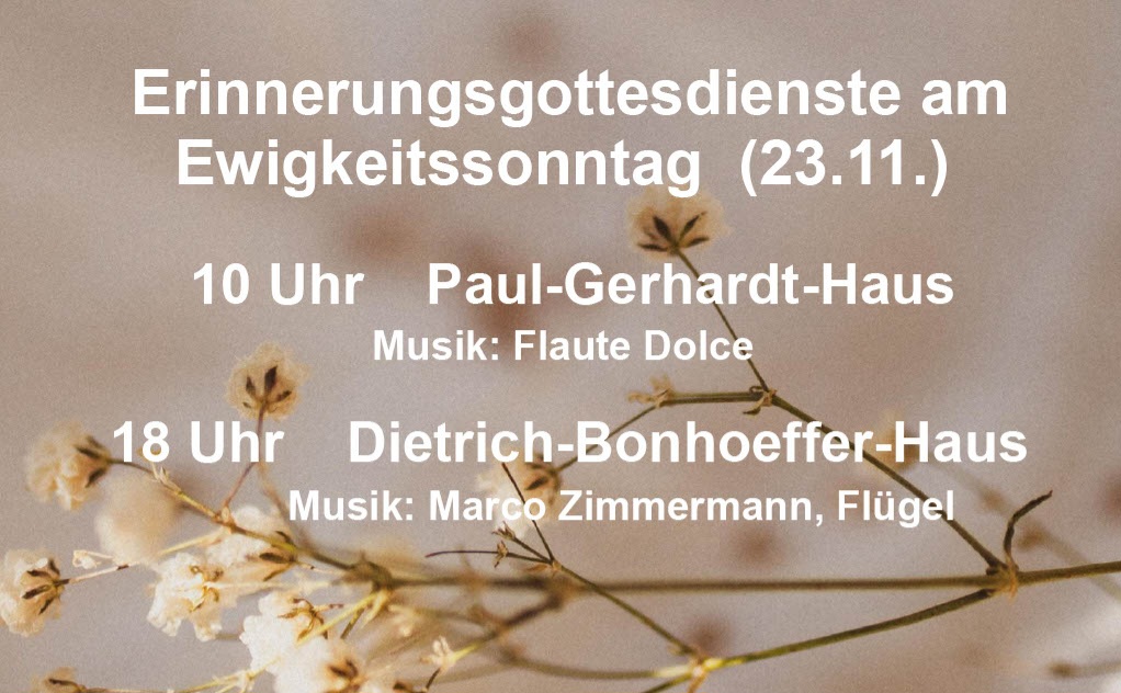 Wer in diesem Jahr sich von einem lieben Menschen hat verabschieden müssen, ist herzlich zu unseren Gottesdiensten am Ewigkeitssonntag (23. November) eingeladen. Mancher Abschied liegt schon einige Monate zurück, andere Abschiede sind noch ganz nah. Die Erfahrung zeigt: Es tut gut nocheinmal derer zu gedenken, die in diesem Jahr verstorben sind. Wir werden ihren Namen nennen und Kerzen als Zeichen der liebevollen Erinnerung und unserer Hoffnung entzünden. Herzliche Einladung also zu beiden Gottesdiensten: